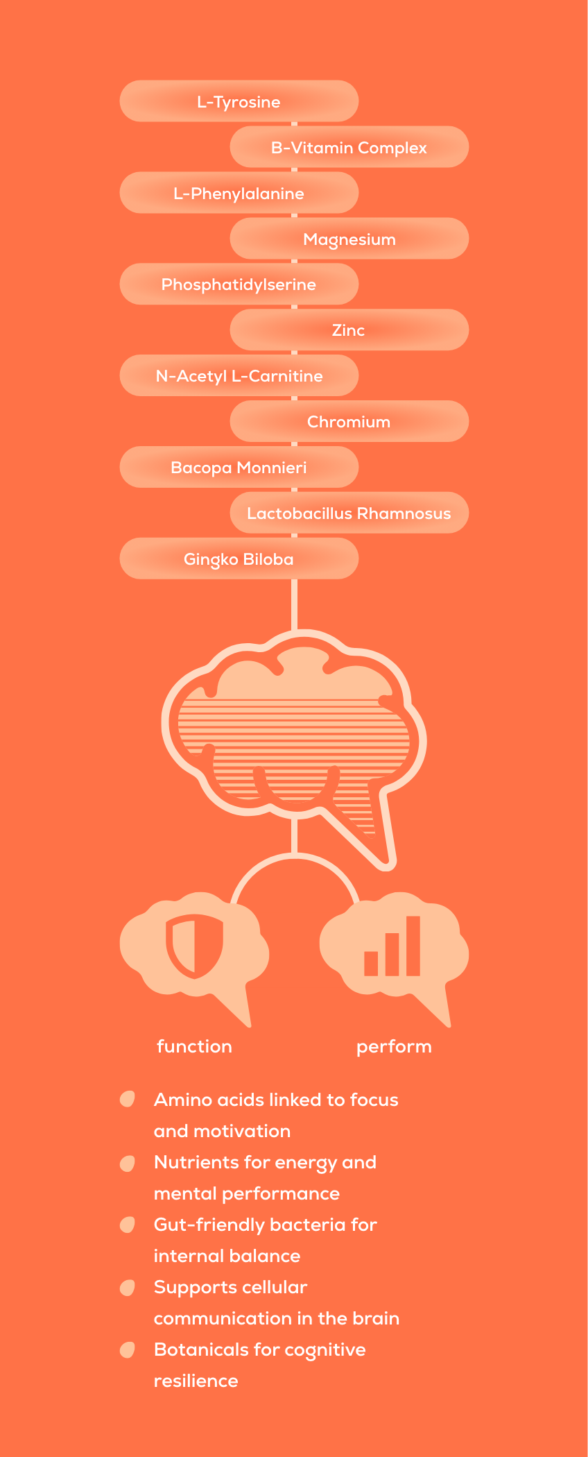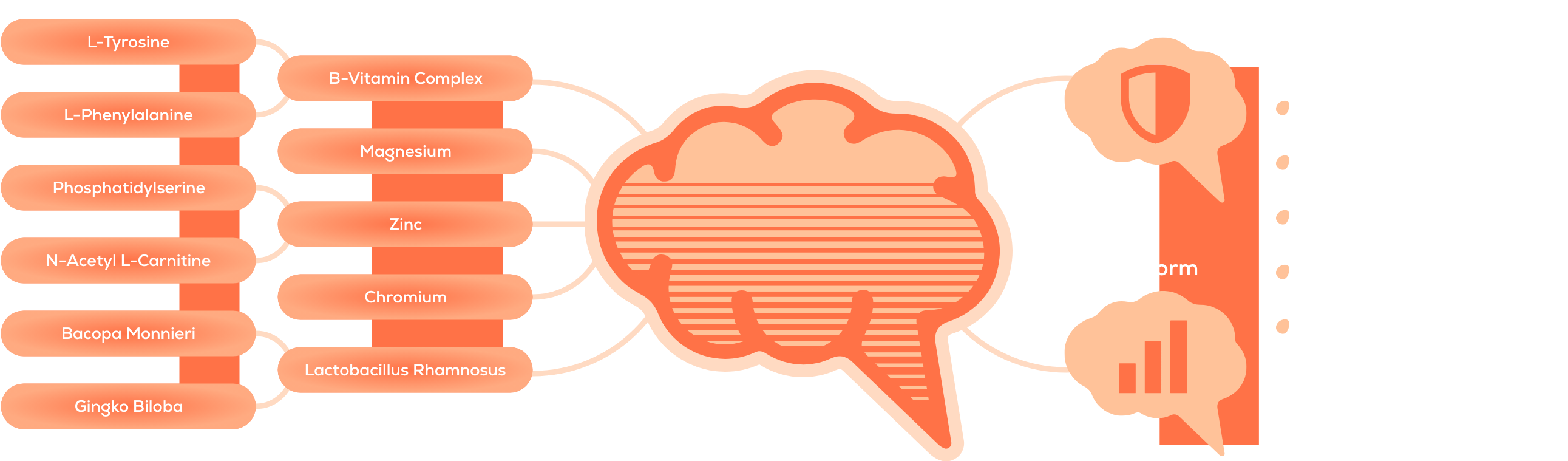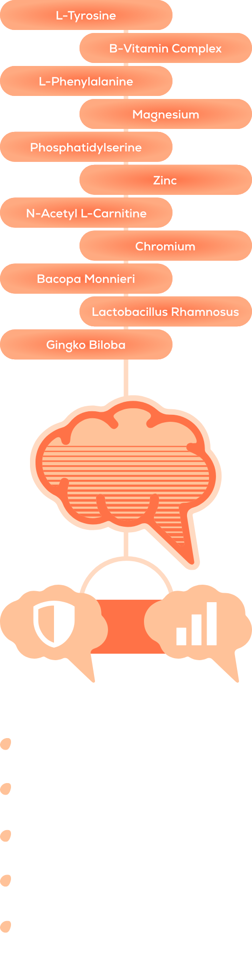 L-Phenylalanine, L-Tyrosine, Magnesium Glycinate, Acetyl L-Carnitine, Phosphatidylserine (from Sunflower), Zinc picolinate, Ginkgo Biloba, Lactobacillus rhamnosus, Chromium picolinate, Bacopa Monnieri, Vitamin B1 (Thiamine hydrochoride), Vitamin B3 (Nicotinic Acid), Vitamin B5 (Calcium D-Pantothenate), Vitamin B6 (Pyridoxine Hyrochloride), Vitamin B12 (Methylcobalamin), Folate (Calcium L- methylfolate)